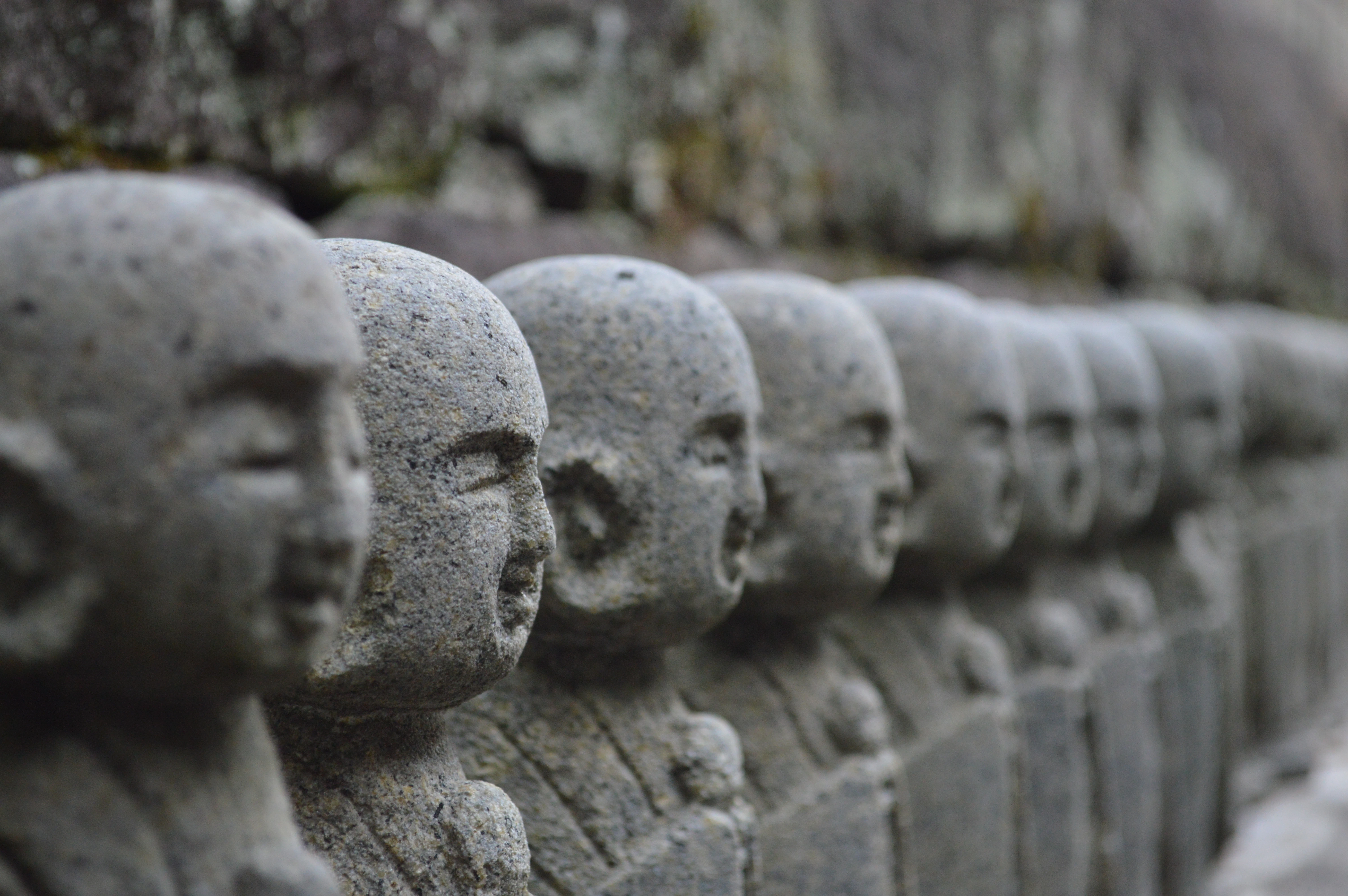 three stone statues sitting on top of a rock