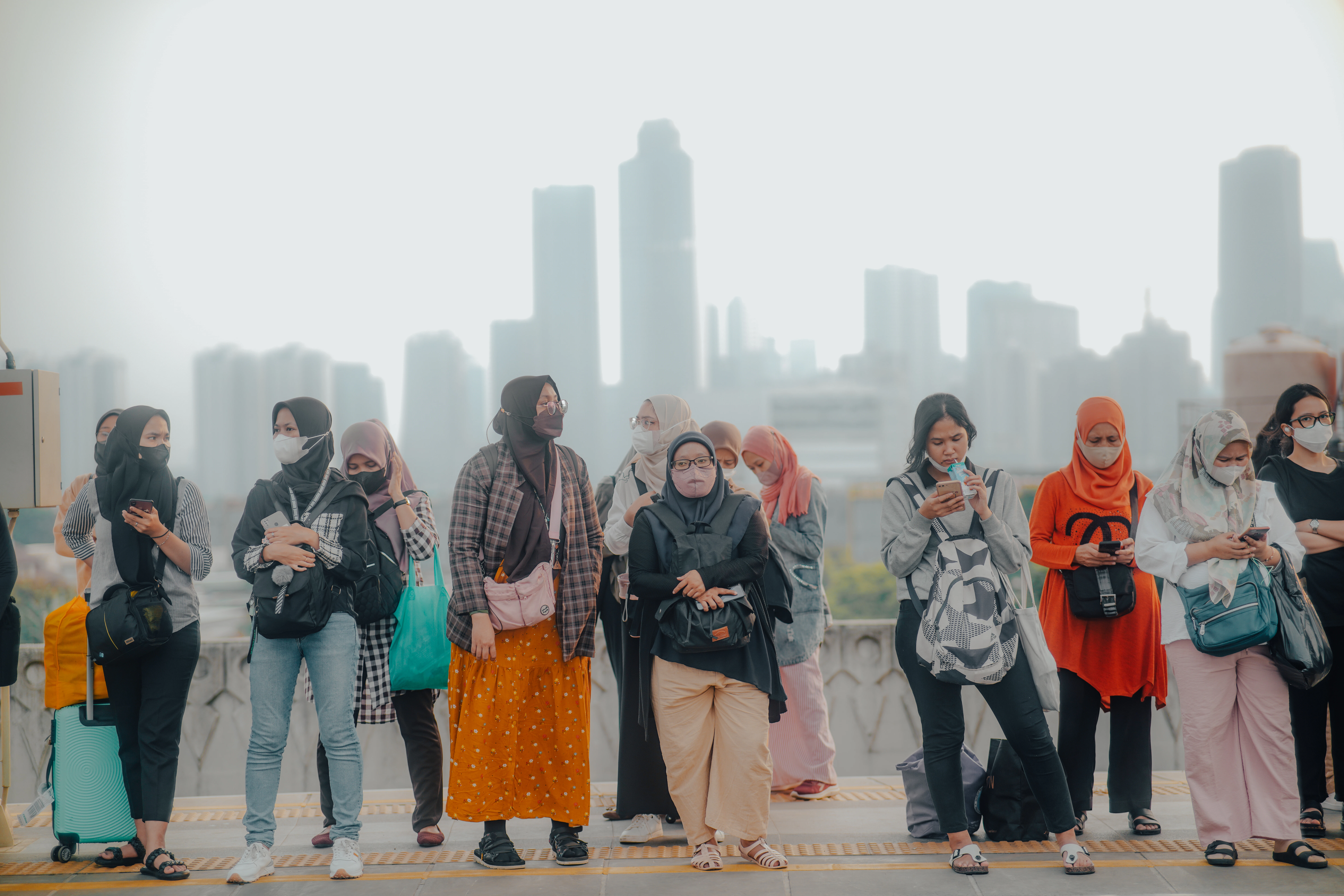 a group of people standing in front of a city skyline