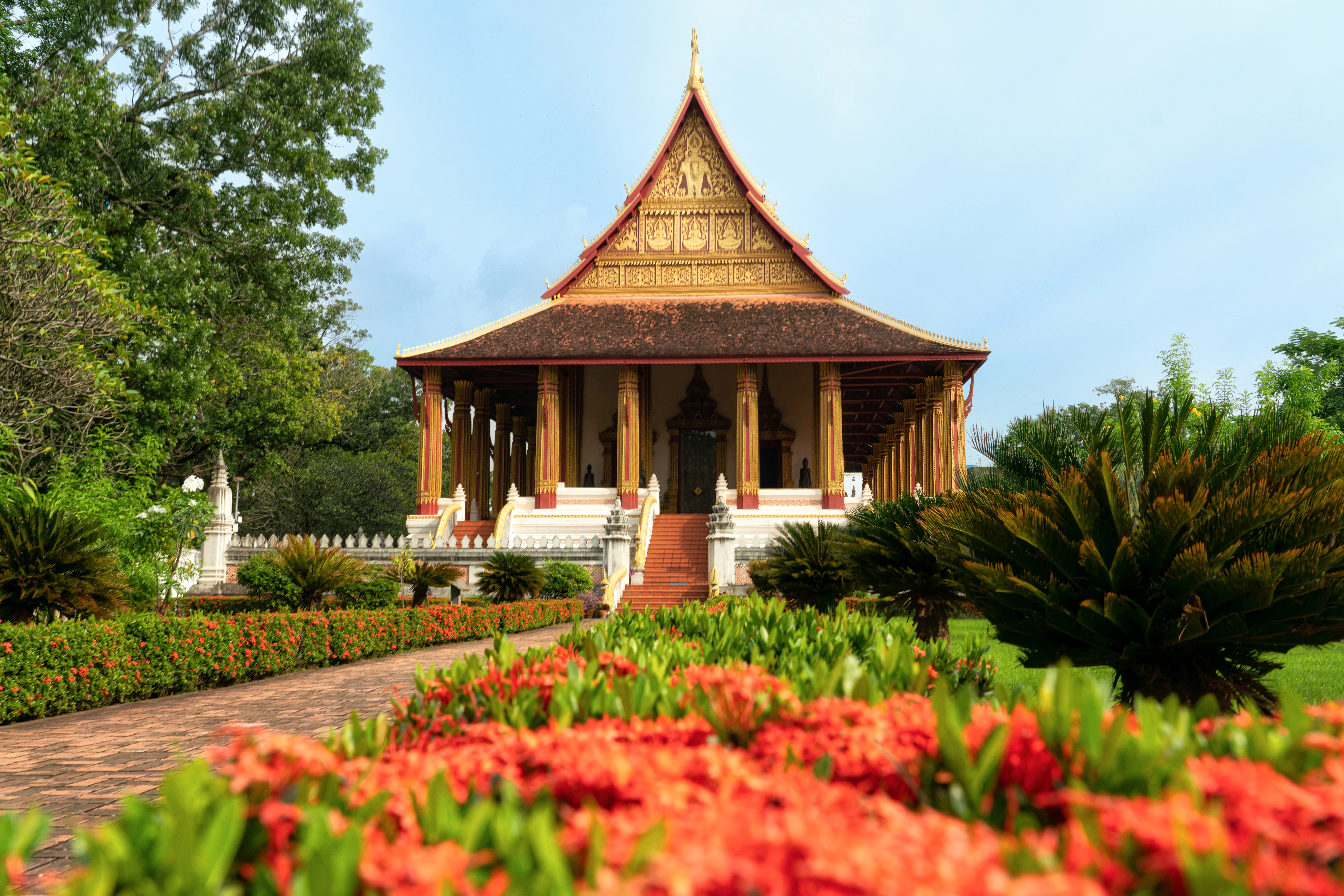 Vientiane, die Hauptstadt von Laos, ist die wohl entspannteste Hauptstadt Südostasiens — eine charmante Kleinstadt am Mekong-Ufer, die mit französischem Kolonialerbe, goldenen Tempeln und einer entschleunigten Atmosphäre Besucher überrascht, die das hektische Bangkok oder Hanoi gewohnt sind. Hier ticken die Uhren langsamer, und genau das macht den Reiz aus. Pha That Luang, die goldene Stupa aus dem 16. Jahrhundert, ist das Nationalsymbol von Laos und strahlt besonders bei Sonnenuntergang in warmem Gold. Der Wat Sisaket, der älteste Tempel der Stadt, beherbergt Tausende winziger Buddha-Statuen in den Nischen seiner Wände. Der Patuxai, ein Triumphbogen im Stadtzentrum, wurde kurioserweise aus amerikanischem Zement gebaut, der eigentlich für den Flughafenbau bestimmt war — die Laoten nennen ihn augenzwinkernd die vertikale Landebahn. Die Uferpromenade am Mekong ist der Treffpunkt bei Sonnenuntergang, wenn die gesamte Stadt zum Flanieren, Essen und Aerobic auf dem Deich zusammenkommt. Der Nachtmarkt bietet laotische Textilien und Streetfood, während die französischen Bagüttes in Vientiane zu den besten Südostasiens zählen — ein Erbe der Kolonialzeit. Ausflüge zum Buddha Park mit seinen bizarren Skulpturen oder zur Whisky-Village Ban Xang Hai ergänzen das Programm. November bis Februar bietet kühles, trockenes Wetter.