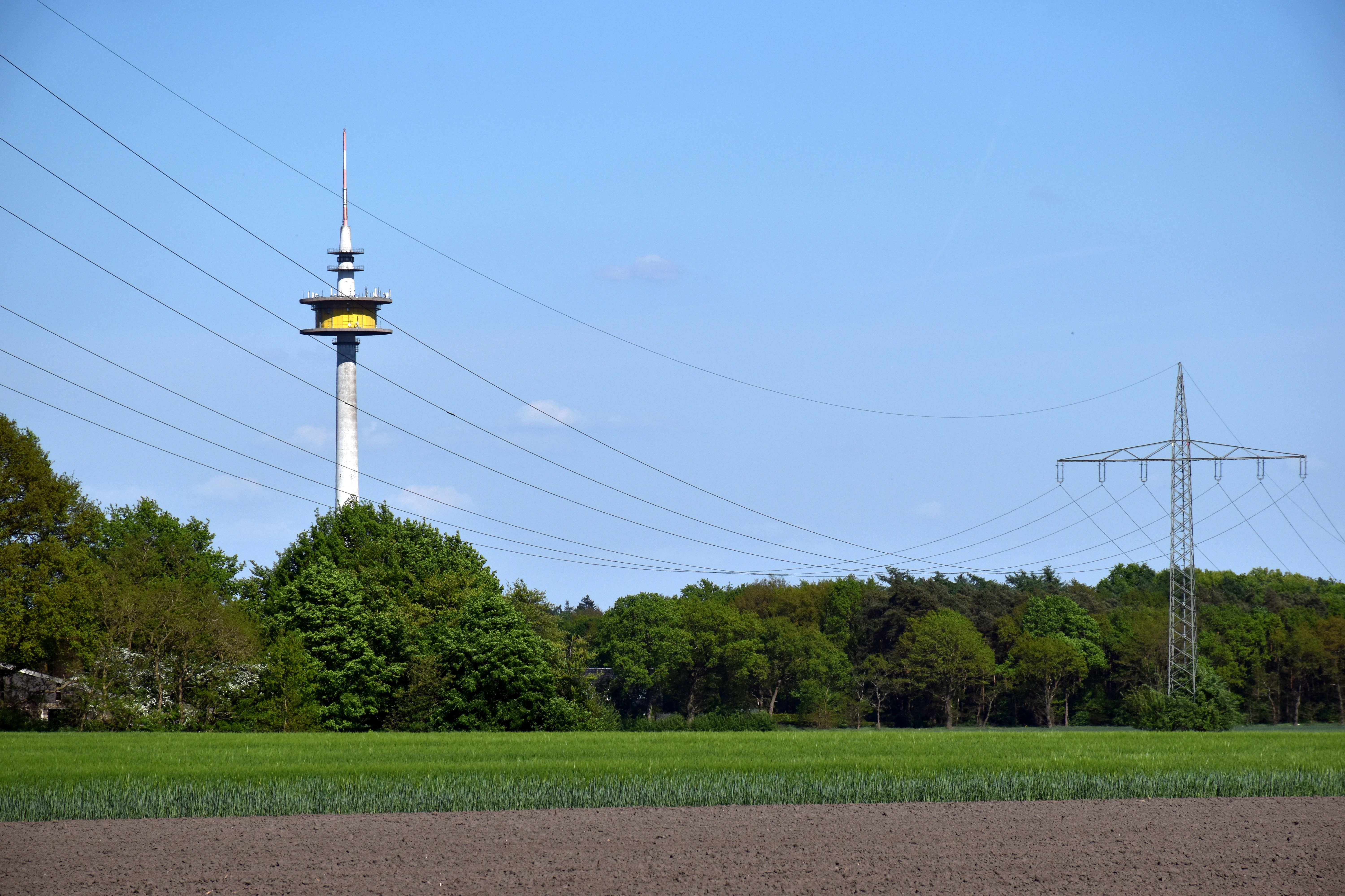 A tall communication tower stands near power lines.