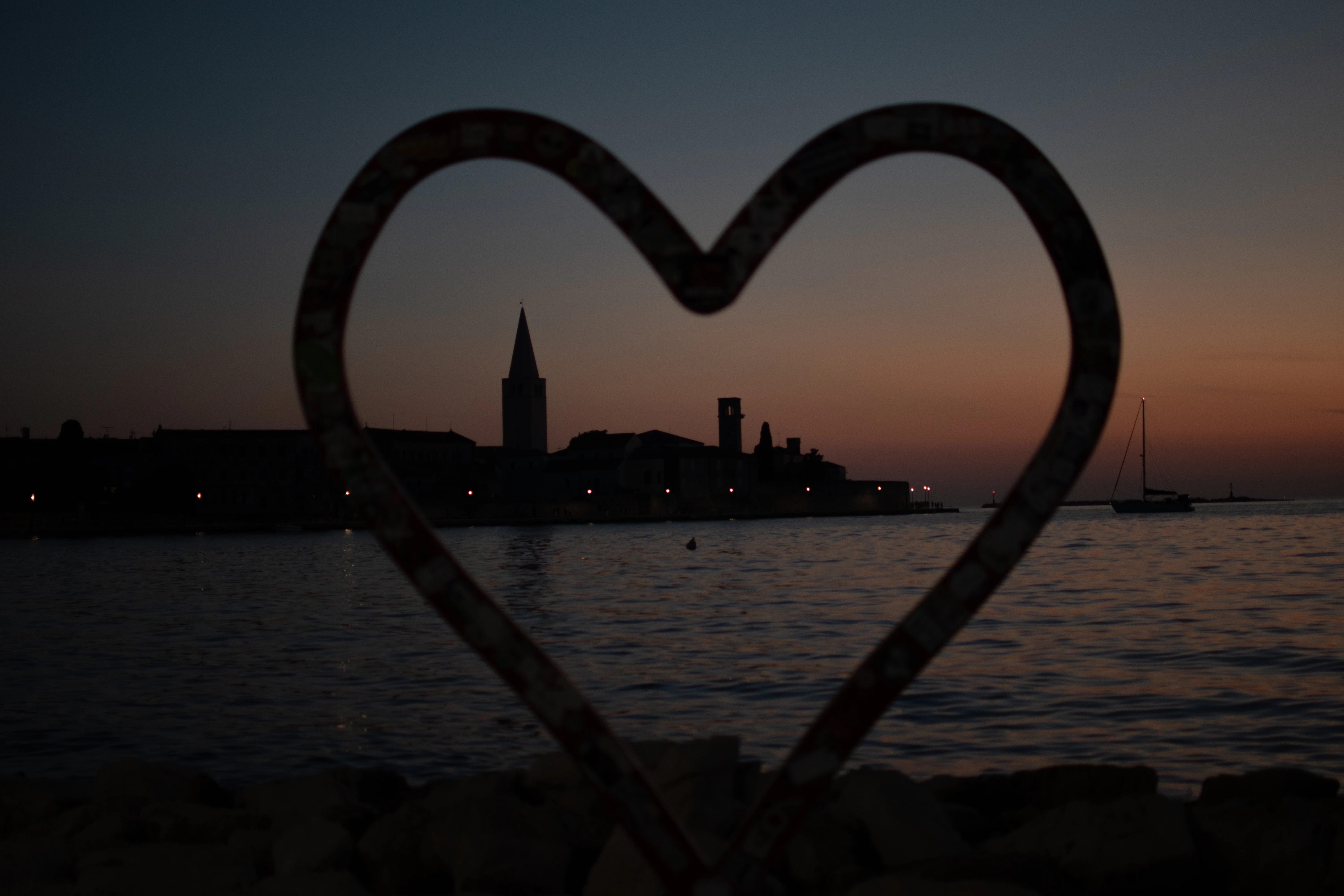 Heart frame overlooking coastal town at dusk