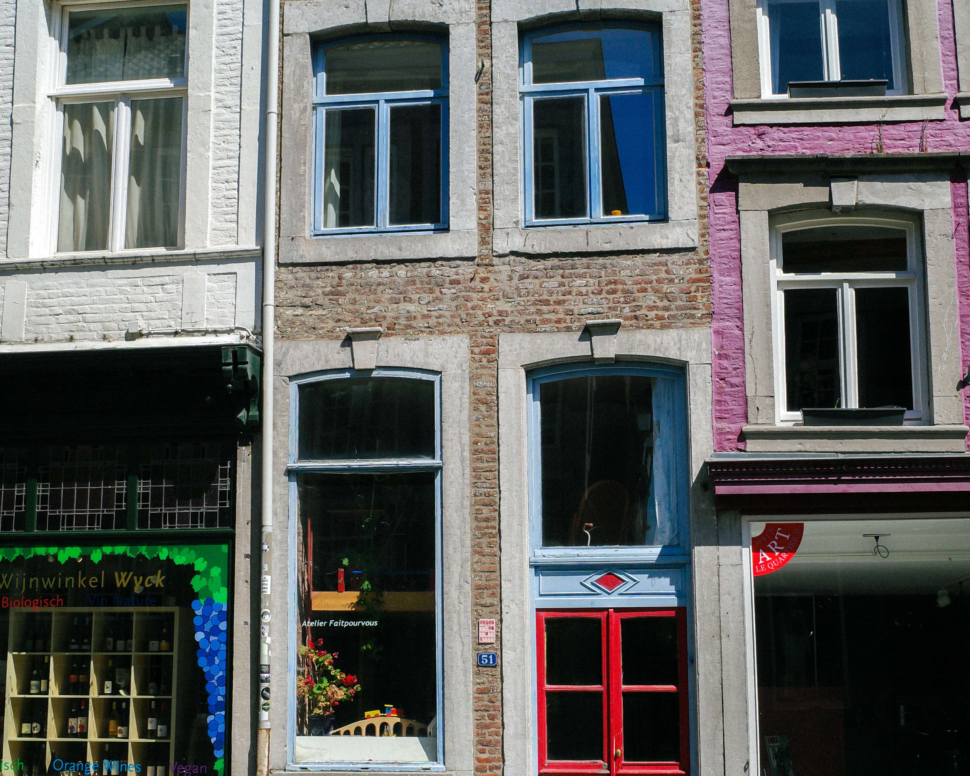 Colorful buildings feature windows in a city setting.