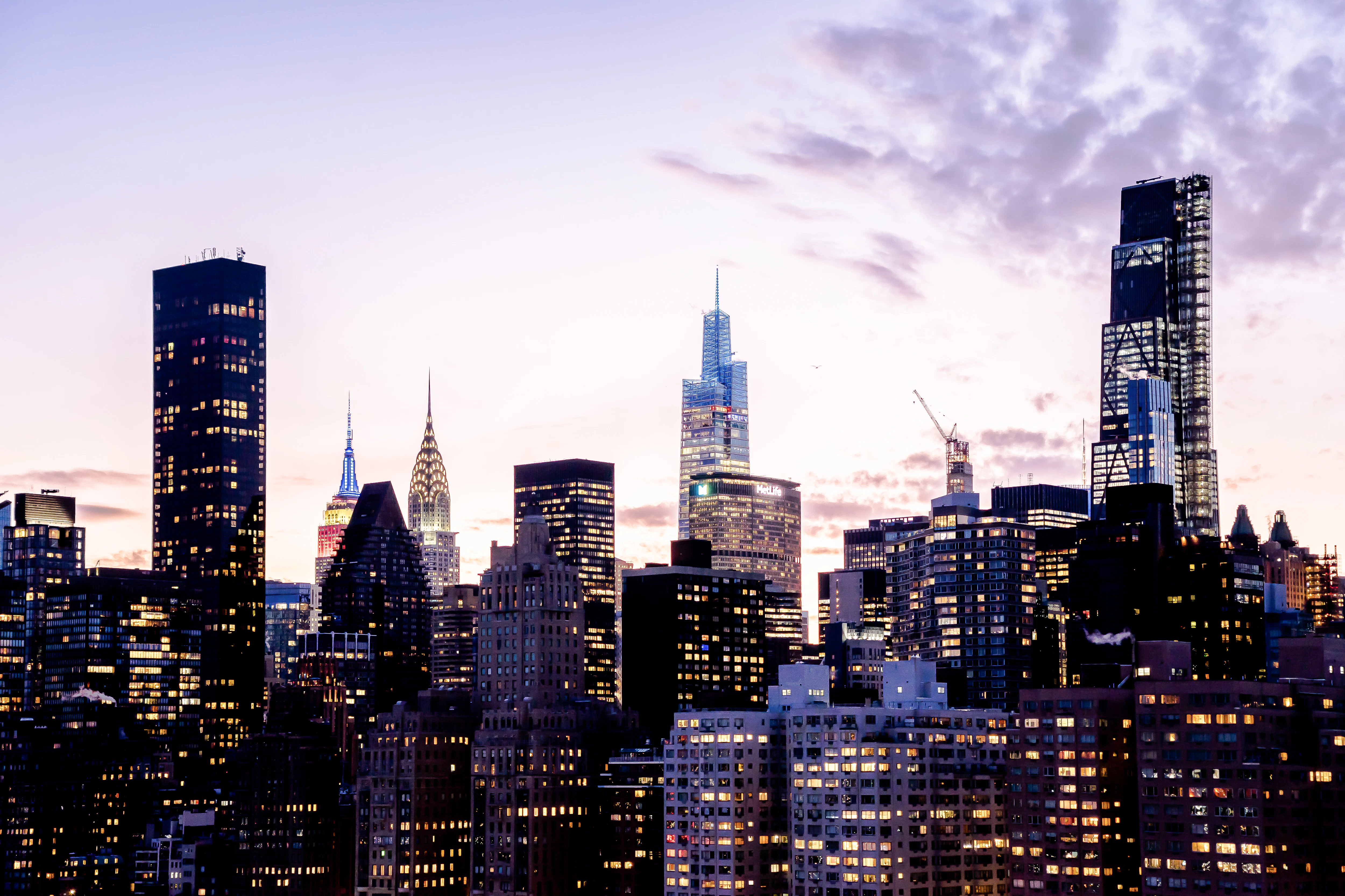 New york city skyline at dusk with lit buildings