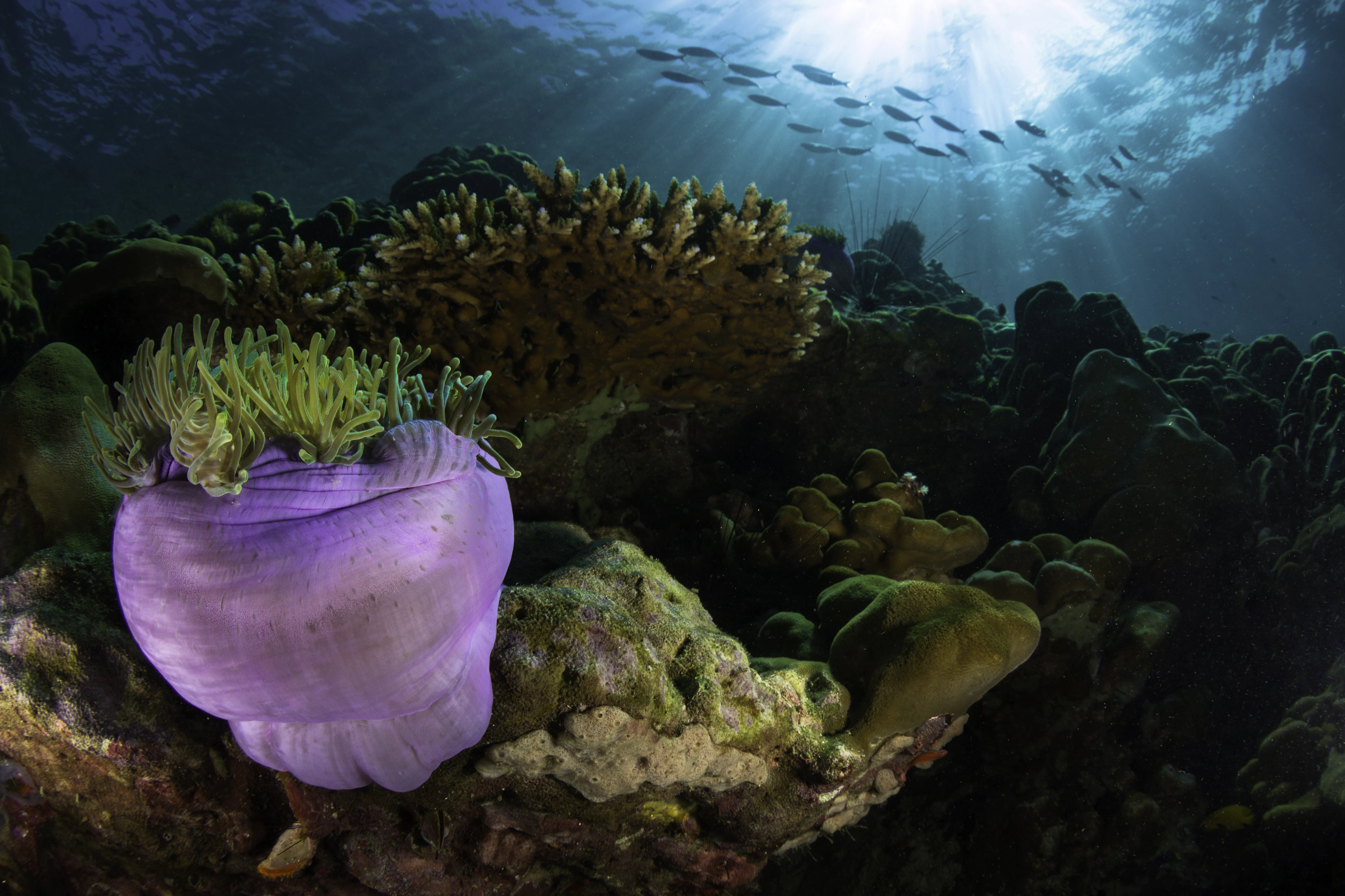 Directement à Sunrise Beach, des poissons clown, des tortues et des coraux colorés nagent près de la plage.