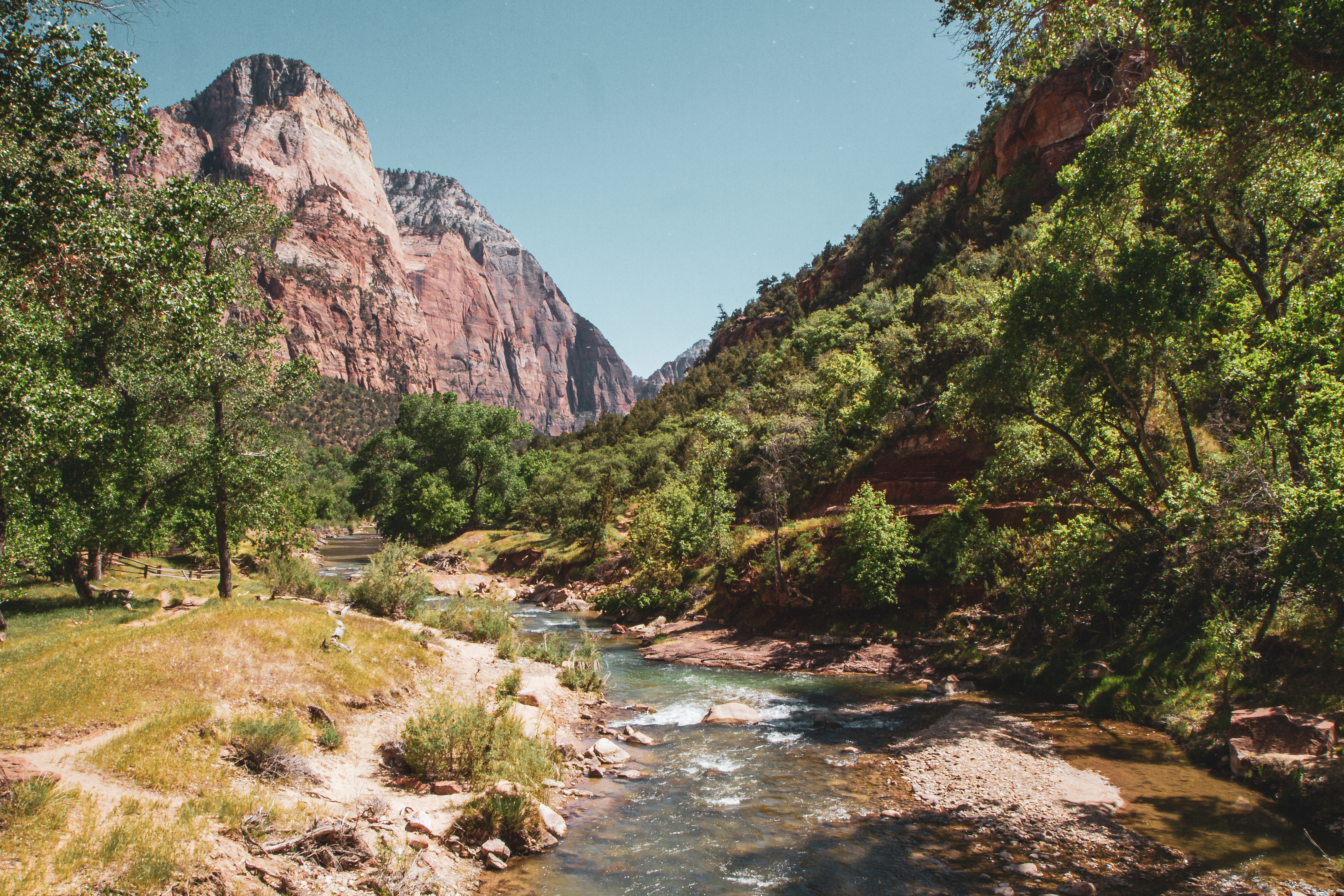 Le parc national de Zion dans l'Utah est un chef-d'œuvre géologique composé de profondes gorges, de gigantesques falaises de grès et de la rivière Virgin émeraude, qui a creusé des murs de 600 mètres de haut en grès rouge Navajo pendant des millions d'années. Le parc fait partie des paysages naturels les plus dramatiques des États-Unis et attire chaque année plus de quatre millions de visiteurs. Le sentier Angels Landing est l'un des sentiers de randonnée les plus célèbres d'Amérique : le dernier tronçon se déroule sur une crête rocheuse étroite avec des chaînes comme main courante et un précipice de 450 mètres de chaque côté — pas pour les personnes ayant le vertige, mais la récompense est un panorama à 360 degrés sans égal. Depuis 2022, un permis (lotterie) est nécessaire, donc planifiez tôt. The Narrows est le programme contrasté : ici, on marche directement dans la rivière Virgin à l'endroit le plus étroit du canyon de Zion, où les murs ne sont qu'à quelques mètres l'un de l'autre et mesurent plus de 300 mètres de haut. Selon le niveau de l'eau, l'eau peut aller de la hauteur de la cheville à celle des hanches — des chaussettes en néoprène et un bâton de randonnée sont obligatoires. La route panoramique à travers le canyon de Zion est accessible uniquement par navette de mars à novembre, ce qui maintient le parc agréablement sans voiture. Le district moins fréquenté de Kolob Canyons au nord offre solitude et l'un des plus grands arcs naturels du monde. Springdale, à l'entrée du parc, est une charmante petite ville avec de bons restaurants et des hébergements.